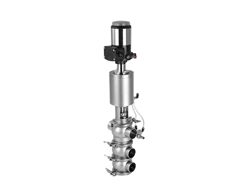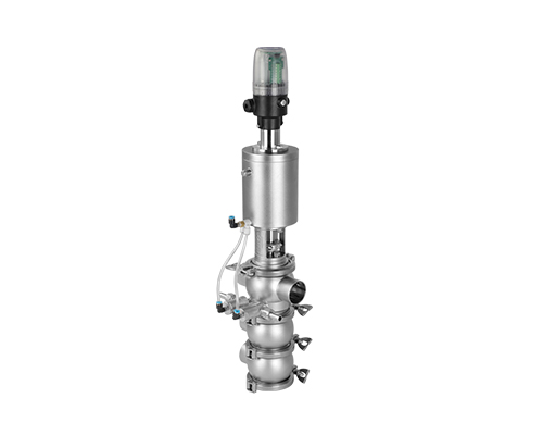 E-C系列防混閥主要由執(zhí)行機構、連接支架、閥桿、閥體組成,閥桿通過執(zhí)行器機構驅動做軸向直線運動,閥桿向上運動時,上下管路通道開啟;閥桿向下運動時,通道關閉。閥桿上設計有兩道密封圈與閥體密封面形成獨立的密封腔,與CIP閥相通,可用于密封檢漏;或上下管路流通不同介質時起到防混監(jiān)測的作用。